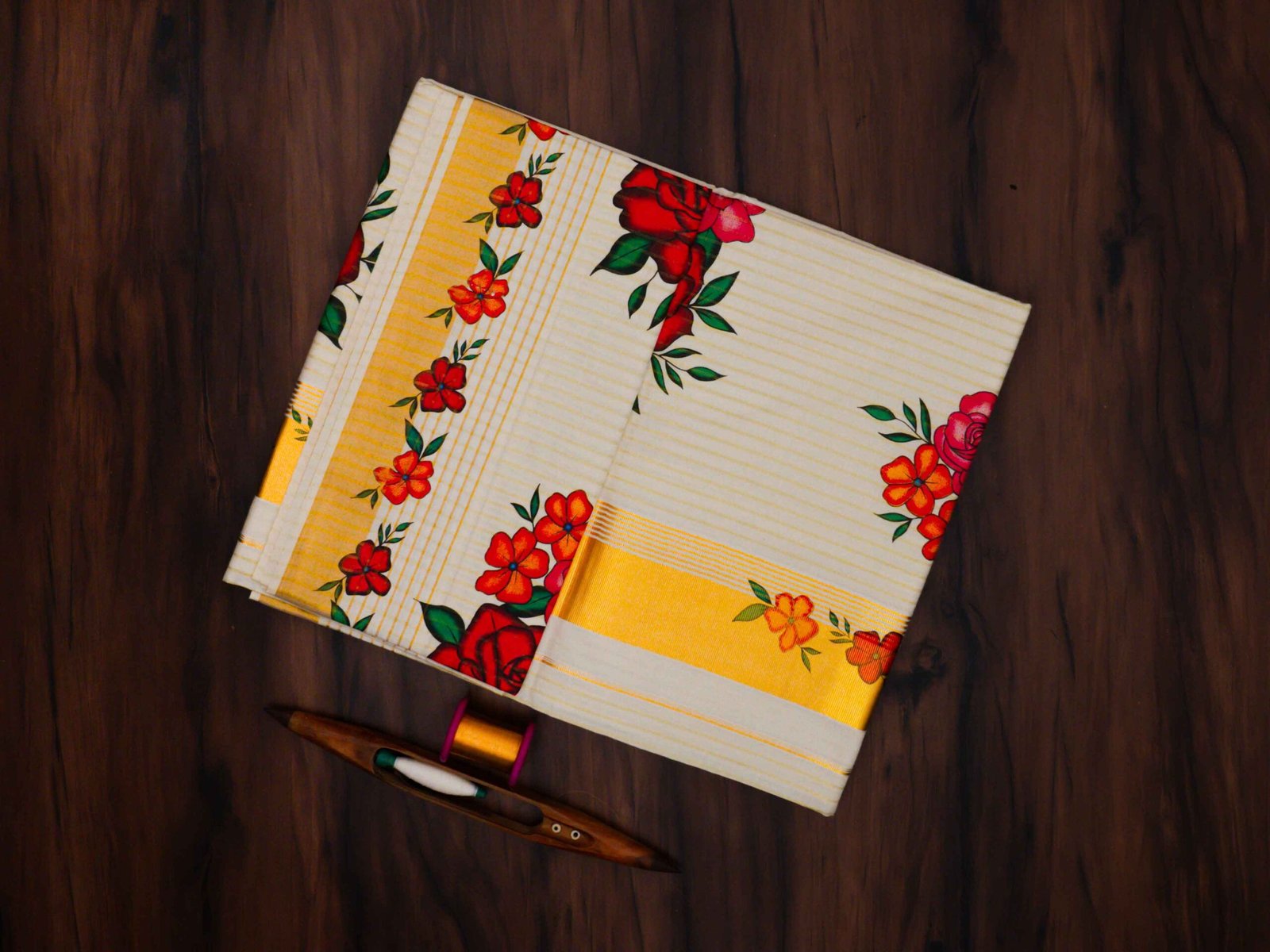 Premium Floral Mural Print Kerala Tissue Saree with Stripes